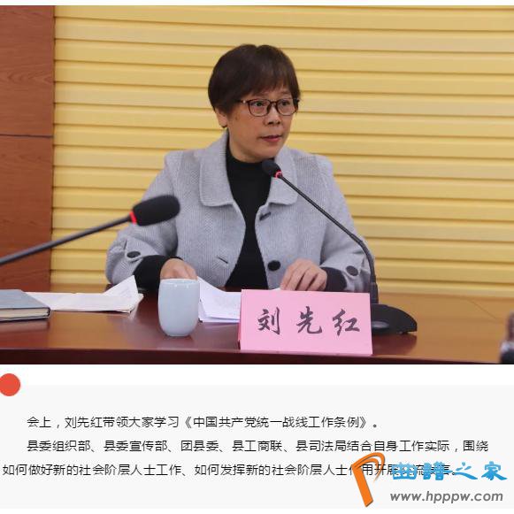 在统战团体开展“传播正能量 共绘同心圆”主题学习活动上和全县新的社会阶层人士统战工作联席会议上,庆元县委统战部副部长刘先红带领大家学习《中国统一战线工作条例》要点。