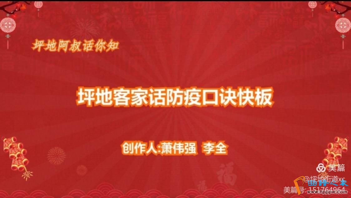 日前,深圳市龙岗区坪地街道党政综合办(宣传部)通过“坪地在线”推出客家话防疫口诀快板,快板作品由萧伟强、李全合作完成,分别从防护常识、科学面对、坚定信心等方面对防疫控疫进行了全方位阐述。运用朗朗上口、便于传唱的客家防疫快板,配上形象生动的防疫画面,剪辑成了新颖独特的防疫宣传短片,深受大家喜爱,在坪地街道居民朋友微信群、朋友圈流传。