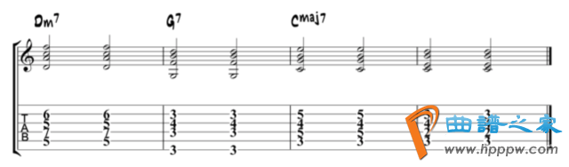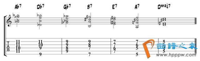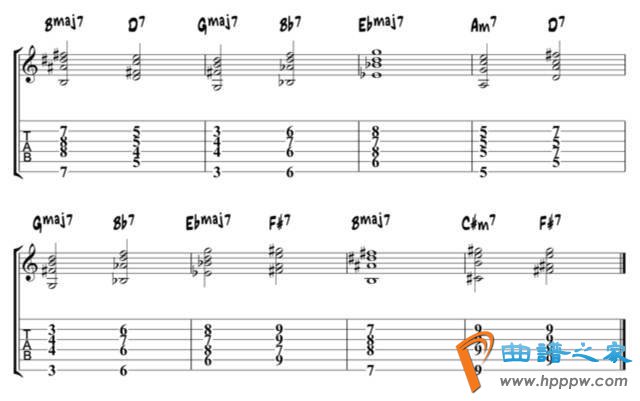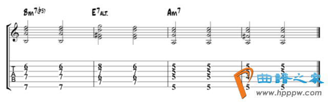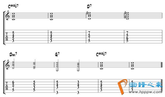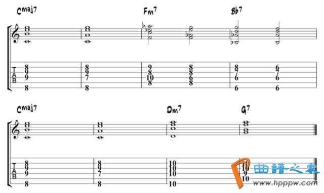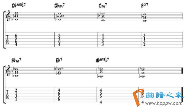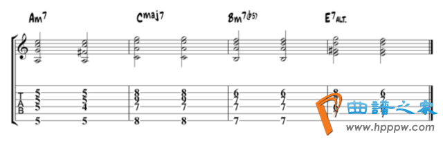 这可谓是爵士乐中最常见的和弦进行了。从IVmaj7 开始顺行向下走到 Imaj7 ,这是作为一个爵士吉他手必须要练习掌握的。不仅因为这是一首著名标准曲中的一部分和声走向,而且通过这段和弦进行你能够练习到减七和弦。在前面介绍的其他爵士和弦进行中,减七和弦是最不常出现的一种和弦。但当它出现时,你要做好准备,知道如何在伴奏当中应付这种和弦。