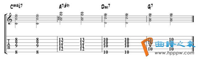 在你已知的和弦指型上做变化和扩展,其好处在于你不用学习新的指型就可以拓展你的和弦语汇,这大大节省了你的练习时间,并让你在演奏中有更多的声音选择加入到伴奏乐句里。对于新的和弦声音,你不仅要练习它的指法,更重要的是要听并记住它们在和弦进行中的声音感觉,这对学习爵士吉他来说是很必要的。