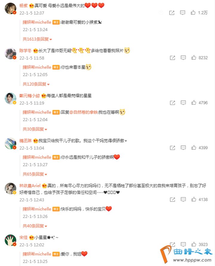 除此之外,许多陈妍希的圈内好友,也纷纷送上自己的祝福。杨紫留言表示:“真可爱,母爱永远是最伟大的。”陈学冬留言:“长大了是帅哥无疑,多给他看看我的照片。”闺蜜杨丞琳留言:“我宝贝给我干儿子的歌,我这个干妈觉得很骄傲。”闺蜜林依晨留言:“真的,所有尽心尽力的妈妈们,无不是牺牲了部分甚至极大的自我来培育孩子,别忘了好好疼惜自己,也给予孩子足够的信任和空间。”此外,还有宋佳、郑元畅、舒淇、柳岩、佟大为等,圈内明星为其留言送祝福。