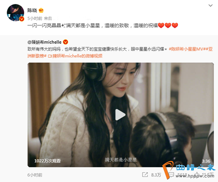 对此,陈妍希并未给予任何回复,其丈夫陈晓也丝毫不理会,不仅积极转发妻子陈妍希发MV的动态,还甜蜜发文表示:“一闪一闪亮晶晶,满天都是小星星,温暖的致敬,温暖的祝福。”