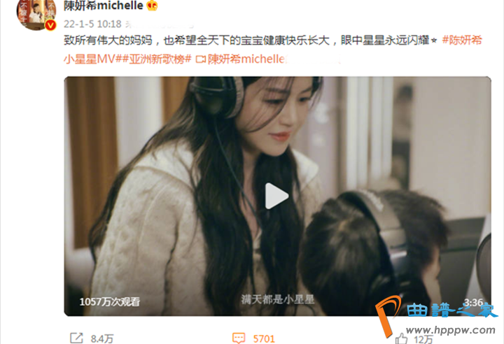 1月5日,女艺人陈妍希通过个人社交平台,晒出一段携手儿子共同出镜录制MV的视频,并发文表示:“致所有伟大的妈妈,也希望全天下的宝宝健康快乐长大,眼中星星永远闪耀。”