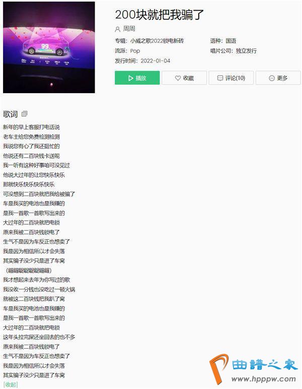 甚至还有“歌手”车主“周周”,为其制作了一首专业歌曲,“200块就把我骗了”,感兴趣的朋友可以听听,歌词和旋律都较为“积极向上”。