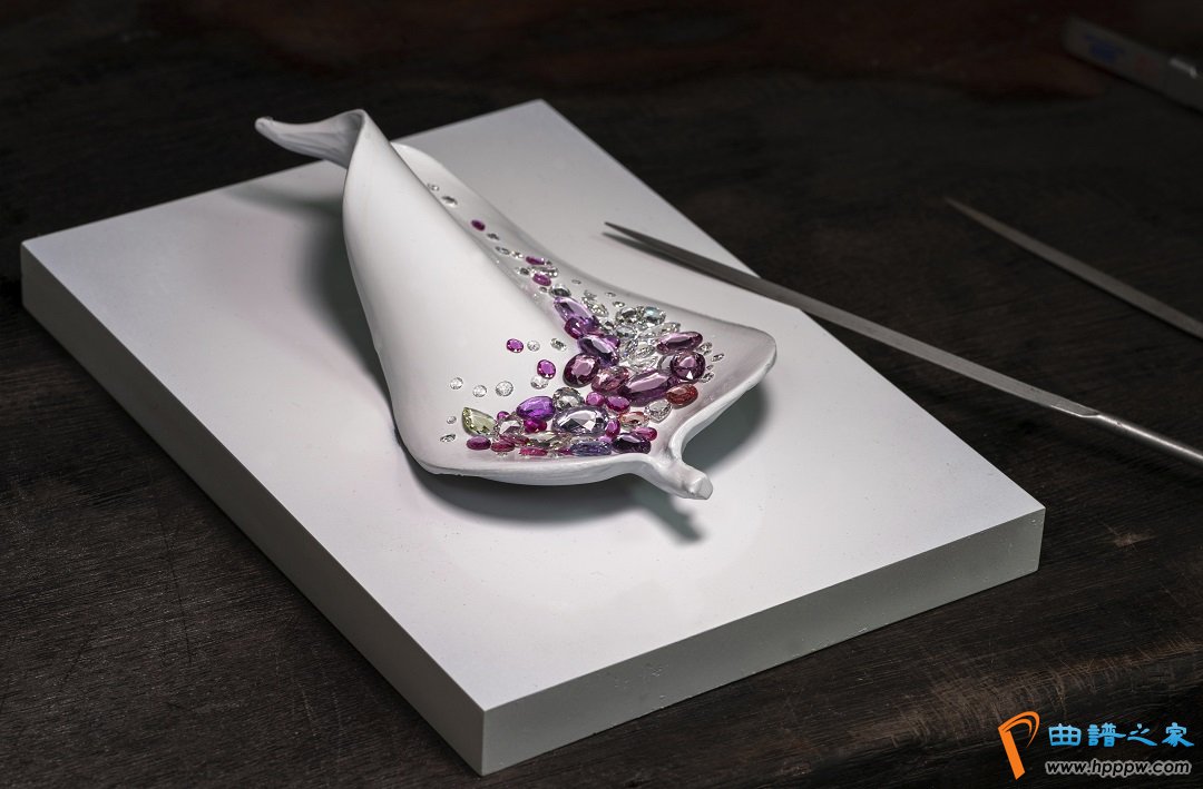 当有了设计概念后,她不惜将矿区顶级原石祖母绿、红宝石、蓝宝石、尖晶石等,施以极为纤薄的切割工艺 (这是一种损耗极大且颠覆通常行业价值观的做法)——令每一片宝石厚度仅1mm-1。2mm却拥有双面玫瑰切面,舍弃明亮切割的张扬夺目,而令火彩更加优雅摄人,更如光谱色轮中的色光般变幻无尽。