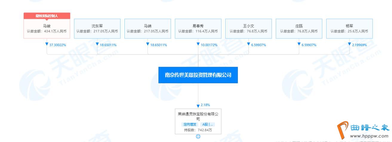 这从莱绅通灵股权架构亦可窥见:截至2019年底,实控人为沈东军、马峻及其一致行动人蔄毅泽(马峻之妻),合计持股64。03%。除每人各自持股外,沈东军、马峻还共同持有南京传世美璟投资管理有限公司(持股莱绅通灵2。18%,为第6大股东,以下简称“传世美璟”)股权。