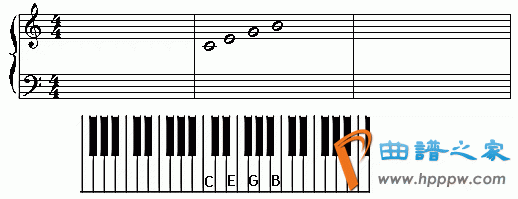 五线谱的音符要么在线上,要么在线间,我们先从线上认识其他的音符。上面的五线谱从中央C上出现的线上的另外三个音符是E G B ,下图是键盘上对应的E G B位置。