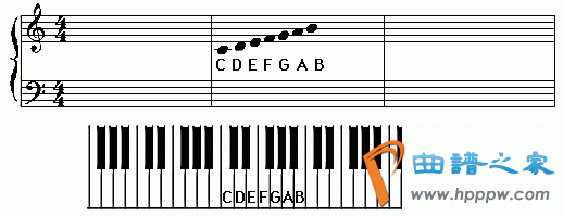 上面的图示显示出在中央C右面 和左面的其他的C在五线谱上面的位置。从中可以看出,在键盘上有规律的C的位置排列到了五线谱上面就没有什么规律可循。换句话说,不同C组的键盘位置在五线谱位置上没有什么联系,你只能通过大量的练习和不断的记忆来逐渐掌握。