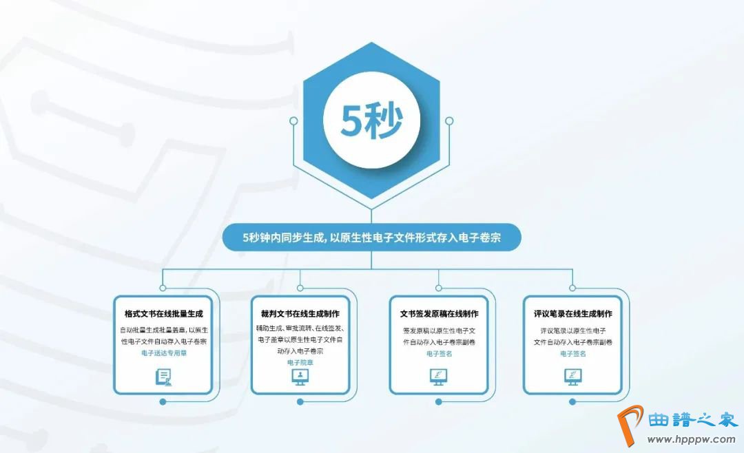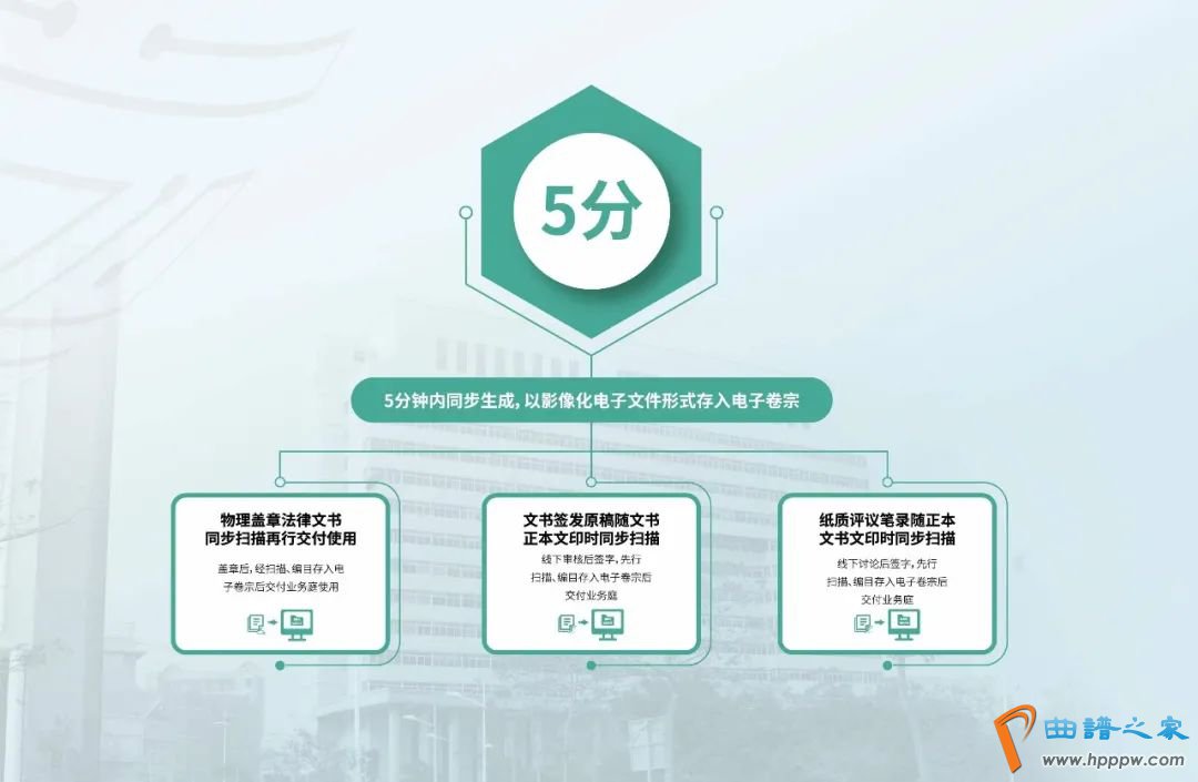 在法律文书制作形成中引入电子签名、电子盖章等技术方案,实现5秒内生成原生性电子文件,不需要另行重复扫描。对需要手动签字、手动加盖物理印章的法律文书,协同印章管理岗、文印室等要求同步扫描成影像化电子文件后再被取走,实现5分钟内生成影像化电子文件。