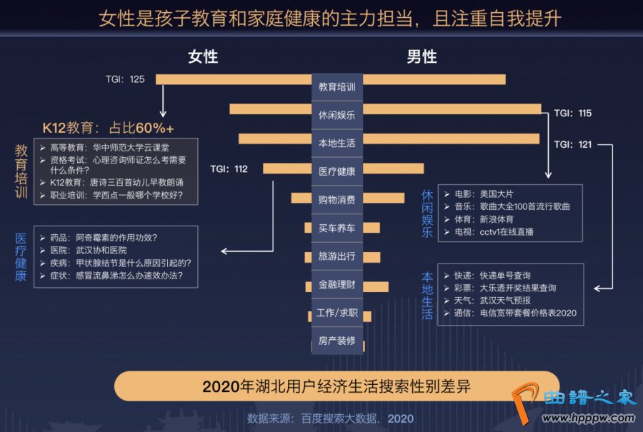 不同性别用户的搜索也有差异。教育培训类搜索以女性用户为主力,并且六成以上的教育培训搜索集中在K12教育。除了紧抓孩子学业的湖北妈妈,上学或初入职场的年轻女性频频搜索“华中师范大学云课堂”、“心理咨询师证怎么考需要什么条件?”等,显示出注重自我提升的特征。同时,历经疫情一役,医疗健康也是她们关心的搜索话题。