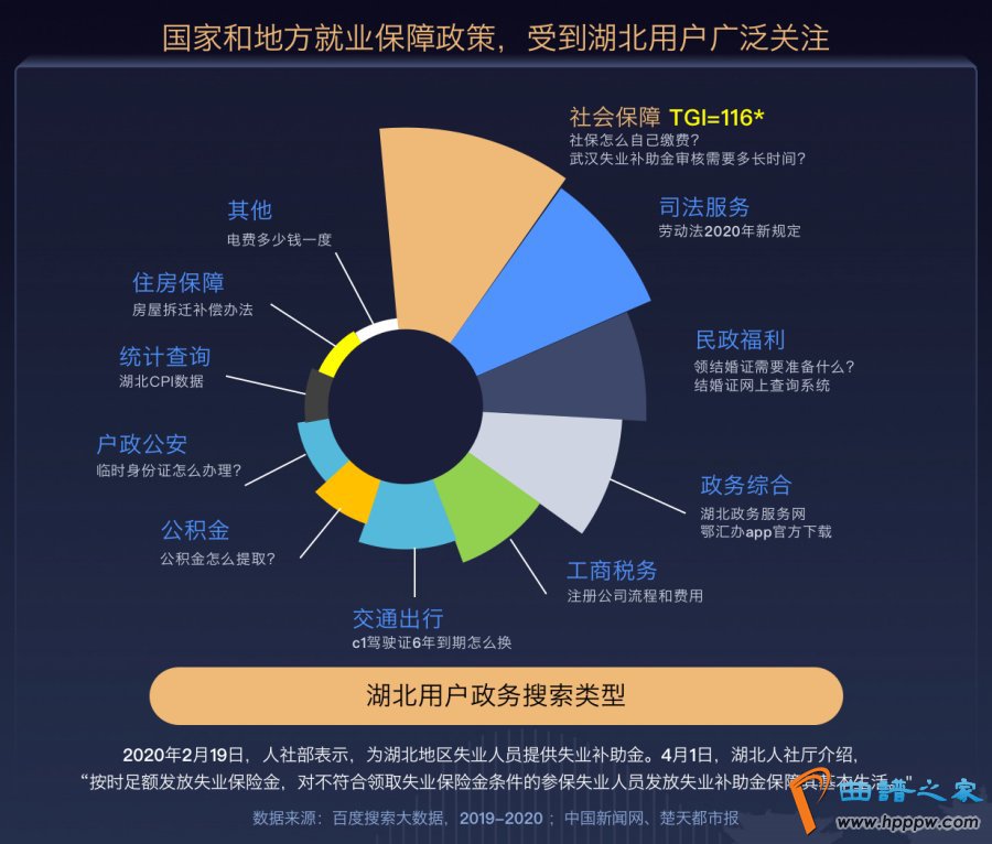 社会保障、司法服务与民政福利是湖北用户在2020年政务搜索最多的前三类型,关系着民生根本。作为回应,相关政务工作及时跟进。2020年4月,湖北人社厅表示,将“按时足额发放失业保险金,对不符合领取失业保险金条件的参保失业人员发放失业补助金保障其基本生活”。