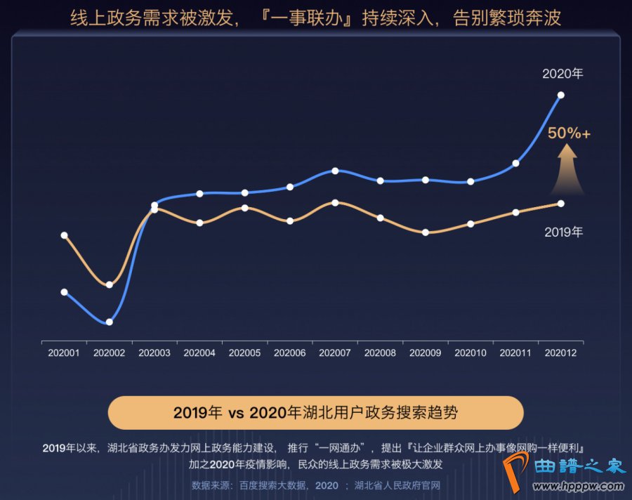人人“宅”家的特殊时期,大大提升了湖北人对线上政务服务的需求。百度搜索大数据注意到,2020年,湖北省的线上政务需求被激发,湖北用户的政务搜索同比上涨50%。湖北省也在发力网上政务能力建设,推行“一网通办”,提出了“让企业、群众网上办事像网购一样便利”的目标。