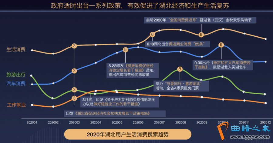 从2020年3月开始,湖北用户生活消费搜索量逐步回升,真实映射了湖北经济与生产生活的快速恢复。湖北适时出台《湖北省促进经济社会加快发展若干政策措施》、《关于应对新冠肺炎疫情影响全力以赴做好稳就业工作的若干措施》等一系列政策,为疫后生产生活做好布局。此后,旅游出行、工作就业、汽车消费等领域的促进政策相继实施,引来本地用户搜索关注。