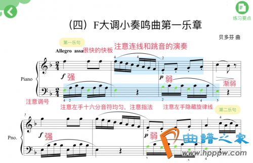 小叶子智能陪练还有“重难点解析”功能,这是小叶子组织了钢琴教育专家团队在APP考级专区内的中国音协、中央音乐学院、中国音乐学院1到6级的考级曲目进行重难点标记,从创作背景、乐句的练习重点、容易出错的音符、表情记号的含义等方面,在谱面上做逐一标注。有了专家老师的重难点标注,孩子们练琴更有重点了。