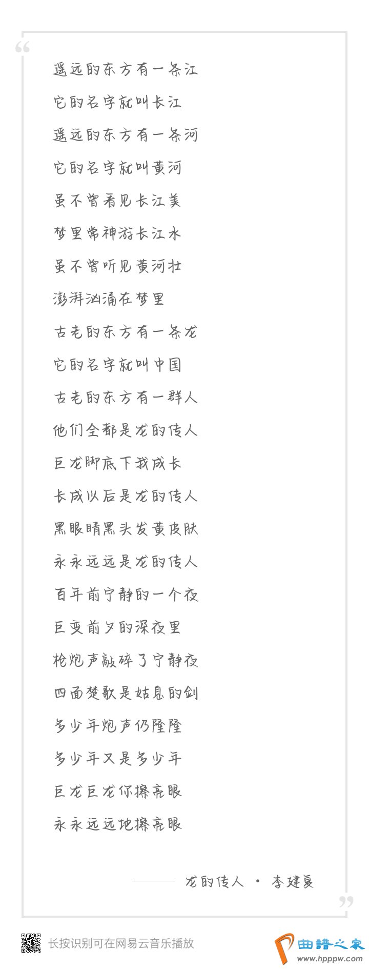 请欣赏歌曲《龙的传人》及背景故事,其次就是“黑眼睛、黑头发、黄皮肤永永远远是龙的传人”这句歌词按这句歌词表达的逻辑关系“古老的东方有一条龙它的名字就叫中国古老的东方有一群人他们全都是龙的传人”可以。我觉得《龙的传人》最后一句歌词很诡异有兴趣的同学来八,混声合唱《龙的传人》《龙的传人》原唱是台湾作曲家侯德健于1978年12月16日创作的作品由台湾男歌手李建复演唱了这首歌随后经香港歌手张明敏演绎歌曲传遍中国而龙的传人也成为。被遗忘的《龙的传人》(龙的传人)乐评,今在家看电视,看到有人唱《龙的传人》