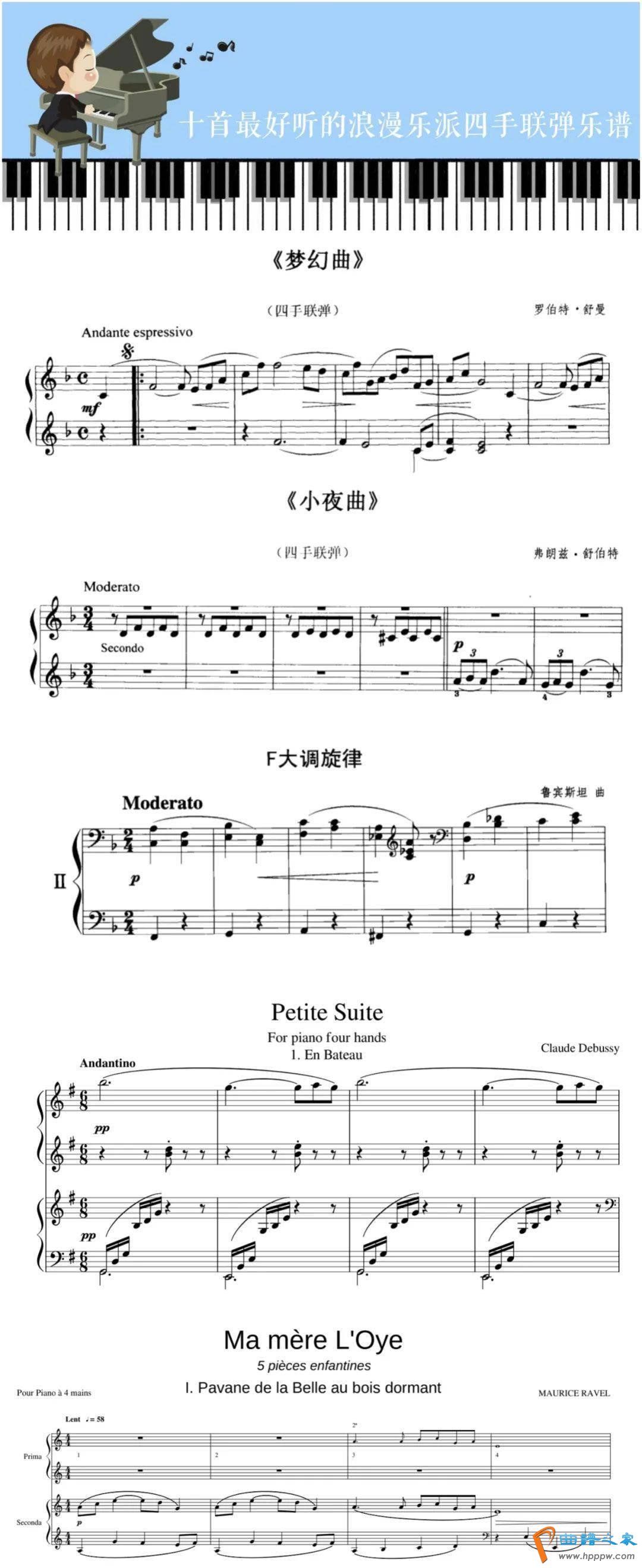 浪漫乐派最大的运气就是赶上了现代钢琴的诞生,不仅满足了个人抒情的需要,更可以让两个人通过一架钢琴,来倾诉彼此的深情蜜意。今天给大家组织的【10首最适合钢琴演出的浪漫乐谱四手联弹乐谱】,是精选了10首不同浪漫乐谱作曲家的最好听的作品,非常适合钢琴音乐会和钢琴比赛使用。
