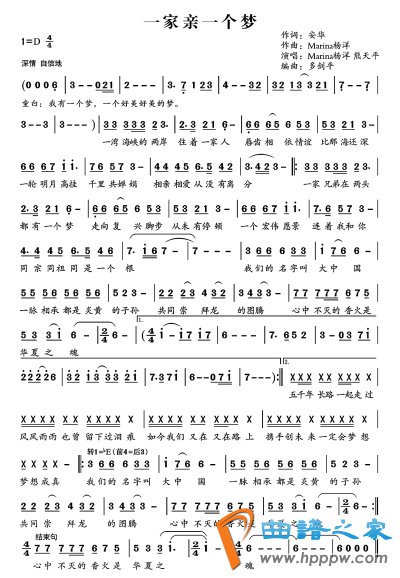 2000年,杨洋创作的歌曲《天涯共此时》成为央视4套国际频道《天涯共此时》栏目周末版的片尾曲,在海内外华人中广为传唱。十几年来,她和熊天平一直致力于推动两岸文化交流。他们以“两岸一家亲 共圆中国梦”为主题,结合自身真实生活经历,创作多首两岸题材歌曲。这首《一家亲一个梦》就是其中的代表作。2015年“习马会”前后,杨洋看到词作者安华内涵深刻的歌词,只用一天的时间,就一气呵成把曲谱了出来。