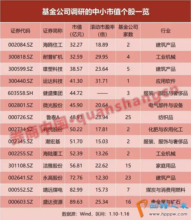 基金公司加大了对中小盘个股的调研力度,市值不足百亿元的公司占比过半。海鸥住工002084)、耐普矿机、雄塑科技300599)、运达科技300440)和健盛集团603558)市值均不足50亿元。