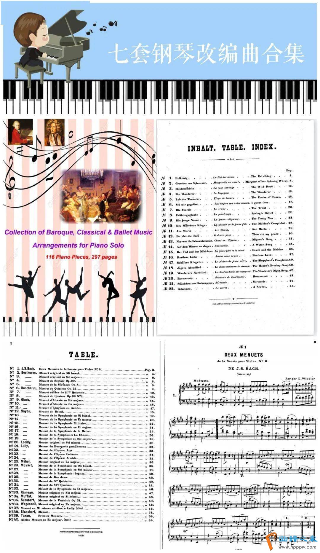 今天推荐大家的《297页116首7套重要钢琴改编曲合辑》,是由7套钢琴改编曲汇编而成,具体作品有舒伯特、海顿、库劳、巴赫、科莱里等等作曲家的作品组成,因此乐谱集的副标题是《巴洛克、古典与芭蕾音乐合辑》,可以说是一套汇集了西方最美的钢琴改编曲的精选集,不容错过!