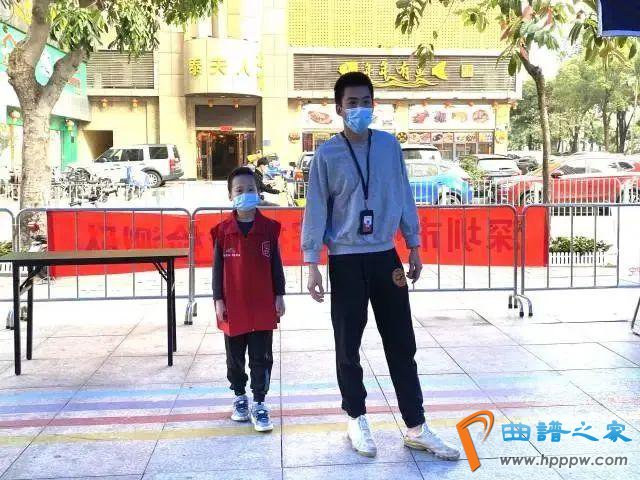 在龙城街道吉祥社区核酸检测点,一位9岁的男孩与家长一同加入疫情防控志愿服务工作。