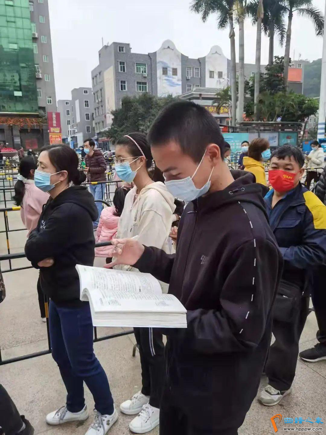 无独有偶,在同个检测点,另一位小少年也一边排队,一边津津有味地看书。他们静心阅读,成为队伍中一道靓丽的风景线!少年们,真棒!