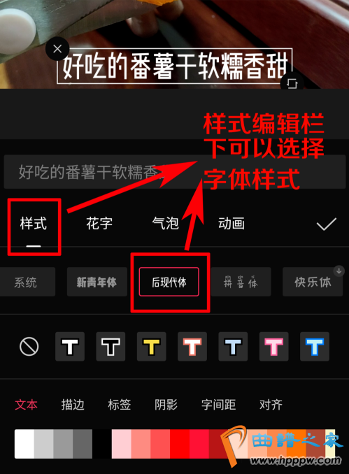 直接拖动画面中的文字周围白色小圆按钮就可以设置文字的显示大小,整体拖动可以修改文字显示位置。点击画面上方的T字母形状按钮,在设置文字样式之前先要三次点击全选文字内容,在显示的文字编辑界面中,依次设置字体、大小、分布方式、粗体、斜体、下划线: