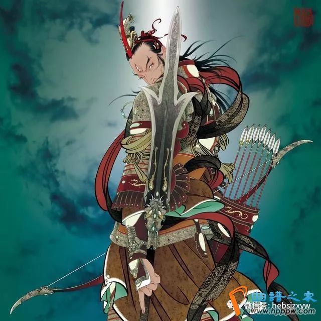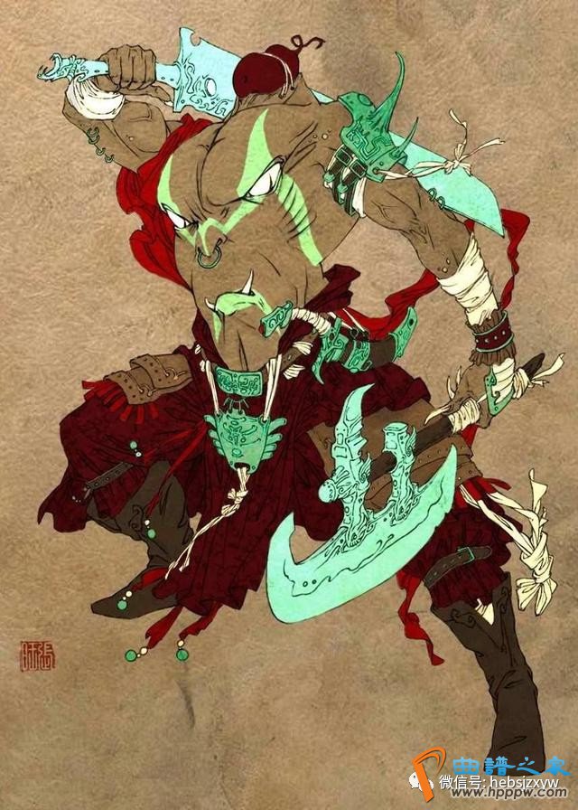 蚩尤:相传蚩尤面如牛首,背生双翅,是牛图腾和鸟图腾氏族的首领,统帅上古九黎部落。相对于汉族一般自认炎黄子孙,苗族则尊蚩尤为祖。秦始皇曾亲祭蚩尤,为八神之一的战神,后世帝王、武将出征之前常祭拜蚩尤以求庇佑。
