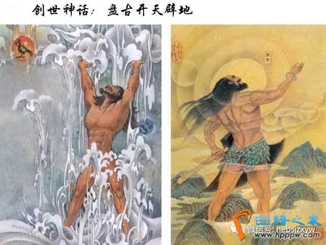 盘古:开天辟地之神。盘古是中国民间神话体系中最古老的神,盘古神话的产生很古老,上古时期人们口口相传,文字记录见于《三五历纪》、《五运历年记》、《述异记》等。