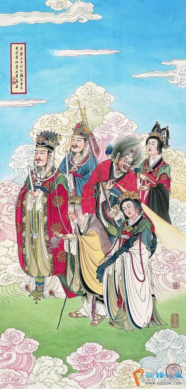 这五位天神,源于古之“五帝”传说。《河图》云:“东方青帝灵威仰,木帝也;南方赤帝赤熛怒,火帝也;中央黄帝含枢纽,土帝也;西方白帝白招拒,金帝也;北方黑帝叶光纪,水帝也”。