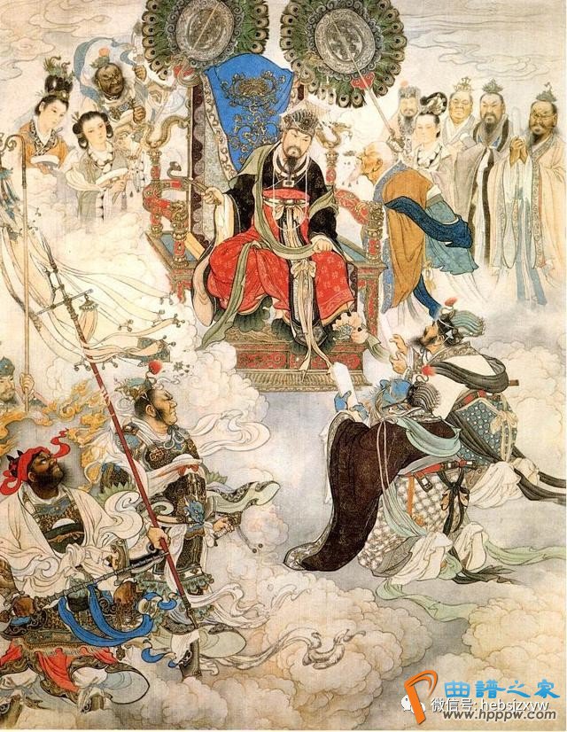 上:玉皇大帝(又称玄穹高上玉皇大帝,昊天金阙至尊玉皇大帝,全称昊天金阙无上至尊自然妙有弥罗至真玉皇上帝), 统御诸神万天;