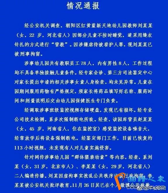 ▶北京朝阳警方昨晚发布红黄蓝幼儿园事件情况通报,监控视频中未发现有人对儿童实施侵害,网传“群体猥亵幼童”经查系虚构。