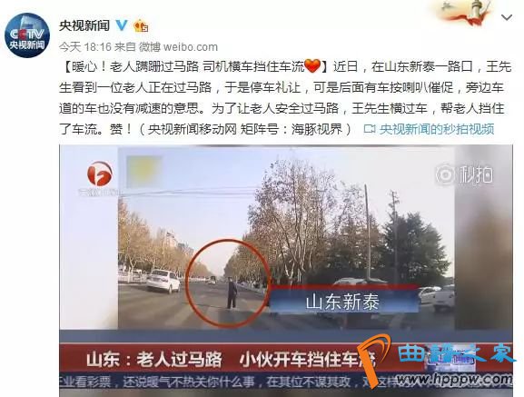 【暖心!老人蹒跚过马路 司机横车挡住车流】近日,在山东新泰一路口,王先生看到一位老人正在过马路,于是停车礼让,可是后面有车按喇叭催促,旁边车道的车也没有减速的意思。为了让老人安全过马路,王先生横过车,帮老人挡住了车流。赞!