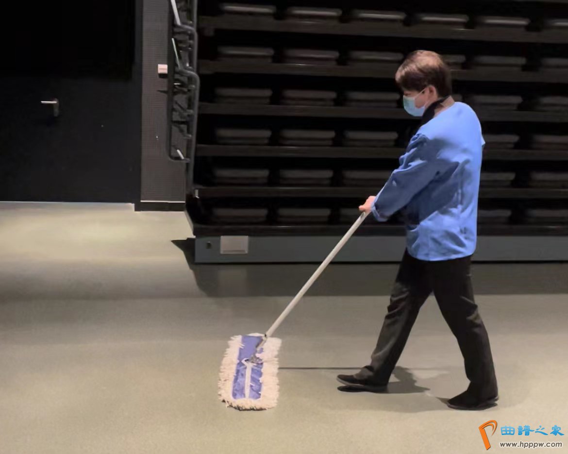 下午的阳光透过剧场巨大的透明玻璃斜斜地射进来,当日采访结束,剧场里的演奏钢琴被推回原位,地面还需要打扫,邢国芹拿起拖把,边往前推、边向左右摆动,这样的动作她再熟悉不过了。