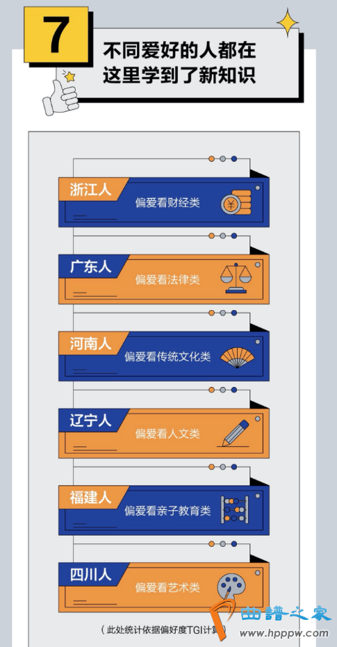此外,报告还呈现了不同人群对于泛知识内容的各自偏好。一二线城市人群偏爱财经类,三四线城市人群更爱看亲子教育类,五六线城市人群更热衷艺术类。其中,浙江人偏爱看财经类,广东人更爱法律类,河南人更喜欢传统文化类,东北人更热衷看人文类,福建人更关注亲子教育类,四川人则更钟情于艺术类。