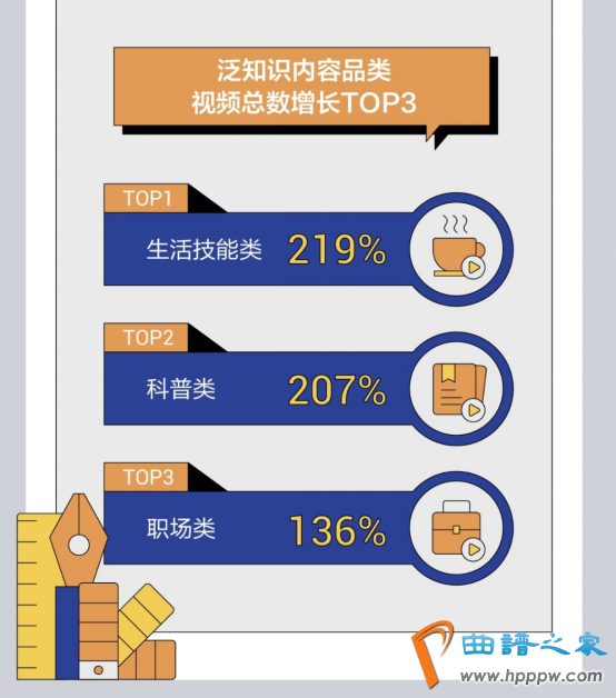 其中,生活技能类内容最受欢迎且增长最快,科普类内容也在快速崛起。在泛知识内容播放品类TOP3中,生活技能类排名第一;在视频增长总数TOP3中,生活技能类增幅达219%,位列第一;科普类增长达207%,排名第二。
