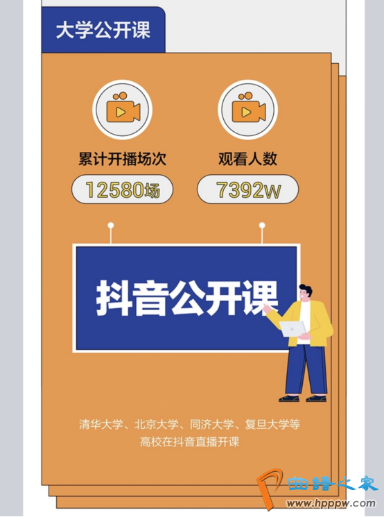 通过抖音,知识正在打破藩篱、走出校园,普惠大众,使得人人都能“上大学”。报告显示,目前抖音覆盖高校已达1259所。其中,清华大学、北京大学、国防科技大学是抖音上粉丝最高的三所大学。过去一年,清华大学、北京大学、同济大学、复旦大学等众多高校在抖音直播开课,累计直播场次达12580场,观看人数达7392万。其中北京大学开播共199场,相当于平均每隔一天就会开播至少一场。清华大学共开播131场。