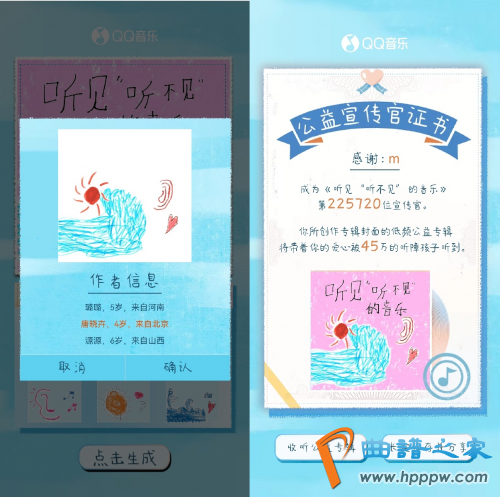 来自全国各地的中高频听力损失的孩子们,亲手用画笔描绘出他们从低频音乐中“听到”的美好画面。网友们可以挑选孩子们手绘的元素,DIY设计H5中的低频专辑封面,成为公益宣传官,和孩子们共创“有爱”的专辑封面。