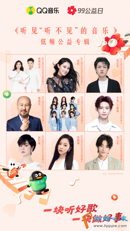 值得一提的是,这张低频公益专辑在歌曲的挑选也颇具心思,收纳了凤凰传奇《一块做好事》、梦然《少年》、钱正昊《九州少年游》、腾格尔《天堂》、THE9 《yes!ok!》、小鬼-王琳凯《拜托了世界》、郁可唯《我的城》、张靓颖《我》、郑云龙《重塑》等歌曲。