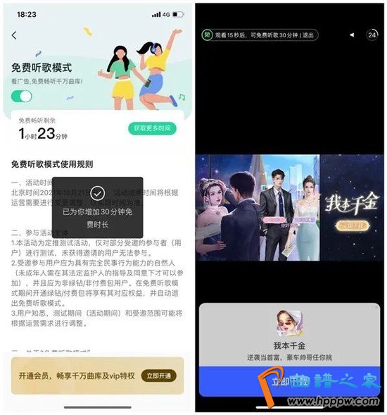 根据上面的截图可以看到,只要观看15秒广告,就可以获得30分钟免费时长,之后就可以听一些会员才能够听到的完整版歌曲了。