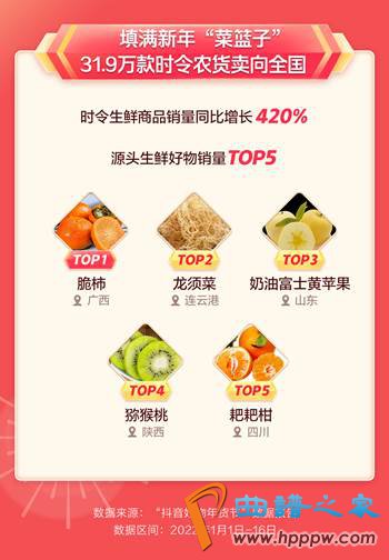 报告显示,年货节期间,抖音电商上线万款时令农货,生鲜类农特产销量同比增长420%。广西脆柿、连云港龙须菜、山东奶油富士黄苹果、陕西猕猴桃、四川耙耙柑颇受欢迎,位列源头生鲜好物销量前五。