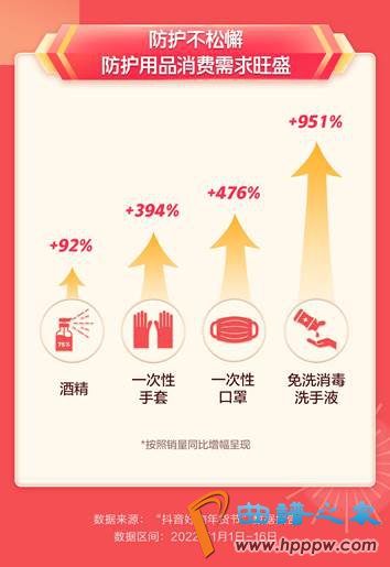 疫情防控不放松,口罩、酒精等防护用品消费需求始终旺盛。报告显示,年货节期间,抖音电商平台上一次性口罩销量同比增长476%,酒精销量同比增长92%。另外,一次性手套、免洗消毒洗手液的销量增长显著,同比分别增长394%和951%。