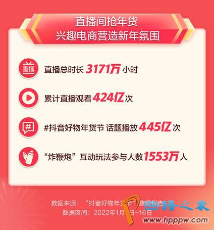 报告显示,1月1日至1月16日,抖音电商直播间累计时长达3171万小时,直播间累计观看人次达424亿次。截至1月16日,#抖音好物年货节 线亿次。