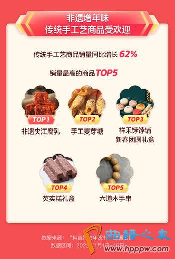 为保护传统技艺,助力非遗传承,抖音电商于2020年推出了“看见手艺计划”,在该计划推动下,非遗传承人、手艺人在抖音电商开拓了新的市场。报告显示,年货节期间,传统手工艺商品销量同比增长62%。非遗夹江腐乳、手工麦芽糖、祥禾饽饽铺新春团圆礼盒、芡实糕礼盒、六道木手串等蕴含传统技艺的产品备受青睐。
