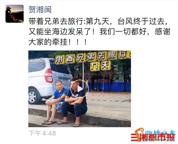 “带着兄弟去旅行:第九天,台风终于过去,又能坐海边发呆了!我们一切都好,感谢大家的牵挂!”11日下午4点48分,贺湘闽更新了一条微信朋友圈,向远在株洲的朋友“报平安”。