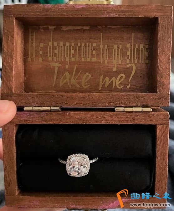 ·实际上“一个人去很危险,拿着这个!”这句台词是《塞尔达传说》初代的老人在林克踏上冒险前,赠送给林克那把剑时说的话,问题来了,这位机灵鬼老外就精心打造了一个塞尔达风格盒子,里面装着求婚戒指,盒子内面正是刻着这句台词,当然是英语版。