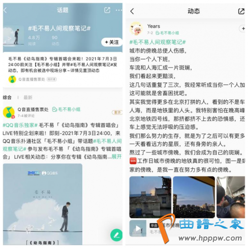 早在首唱会消息官宣后,就诚意满满地接连推出了一系列独家宠粉福利。除了在站内预约的首唱会录制现场的抽奖机会外,扑通社区[毛不易小组]开启了话题活动#毛不易人间观察笔记#,邀请大家随心分享自己在新专中最喜欢的一段话或一句歌词。首唱会现场,毛不易便翻牌了该话题下《城市傍晚》评论区的幸运网友,并向所有在城市里打拼的乐迷隔空喊话:“不辜负自己,用力地在每一天生活下去”。看到偶像念出自己的评论和故事并给予鼓励,不少粉丝也在屏幕前激动落泪,通过留言表示“与毛不易的心又更近了一点”、“喜欢这样浪漫又温暖的环节”。而承载该活动的扑通社区,也成为越来越多“暴发户”为毛不易应援打call的首选聚集地。