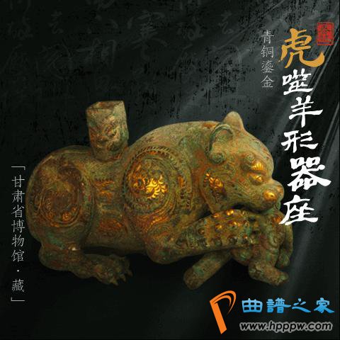 甘肃博物馆登上五福文物彩蛋卡的“青铜鎏金虎噬羊形器座” 是国家一级文物,高15厘米,长23厘米。器物整体铜铸鎏金,圆体空腔,虎呈俯卧状,背中部有方形插孔。虎双目圆睁,两耳直竖,正在吞噬一只柔弱的小羊。该文物是春秋时期虎造型文物的特殊代表作品,它蕴含了丰富的艺术表现形式,是这一时期的青铜器装饰造型中具有代表性的艺术表现手法。