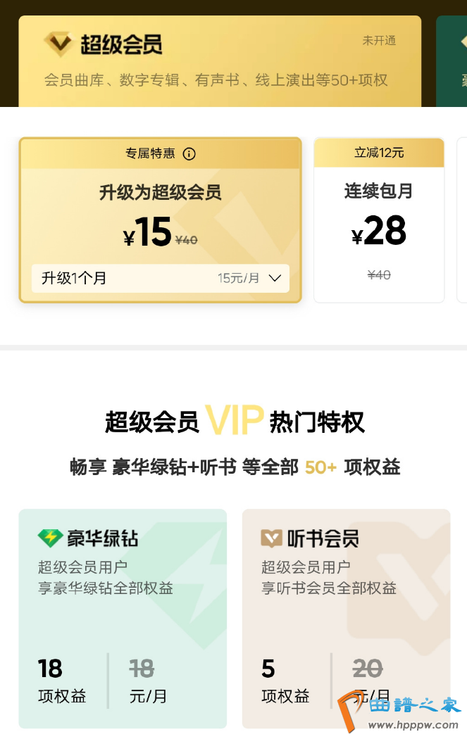 近日,有细心网友发现,QQ 音乐在测试版本中新增了超级会员的功能。据了解,超级会员将享有包括豪华绿钻、听书会员、全民K歌会员,以及包括有声书、数字专辑和线多项权益。从安卓测试版来看,超级会员连续包月为28元/月,豪华绿钻用户直接升级费用为15元/月。