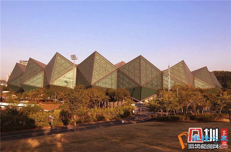 来到大运公园一处山包顶端,眼前就便是大运中心体育场了。远远看去,“水晶”造型的场馆似乎缩小了不少,大概只有越靠近它,才能越感受它真实的庞大与恢弘。