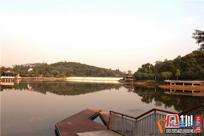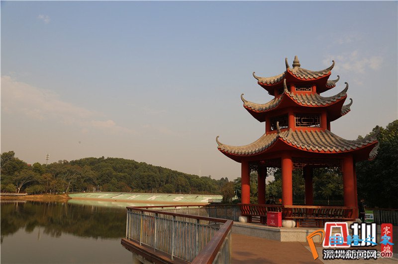 神仙湖波光粼粼,群山环绕郁郁葱葱。沿湖,中式古典、西式浪漫两座特色凉亭和栈道、观景台是观水、亲水佳处,广州樱、洋紫荆等多种开花植物点缀路途。